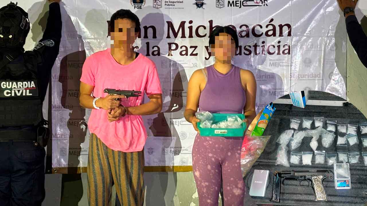 Uruapan, Mich.- 15 de enero de 2025.- Un hombre y una mujer que tenían en su poder varios gramos de droga sintética de la conocida como “crystal” listos para su venta y una pistola fueron detenidos la noche del pasado miércoles por elementos del Grupo Motorizado de la Guardia Civil.