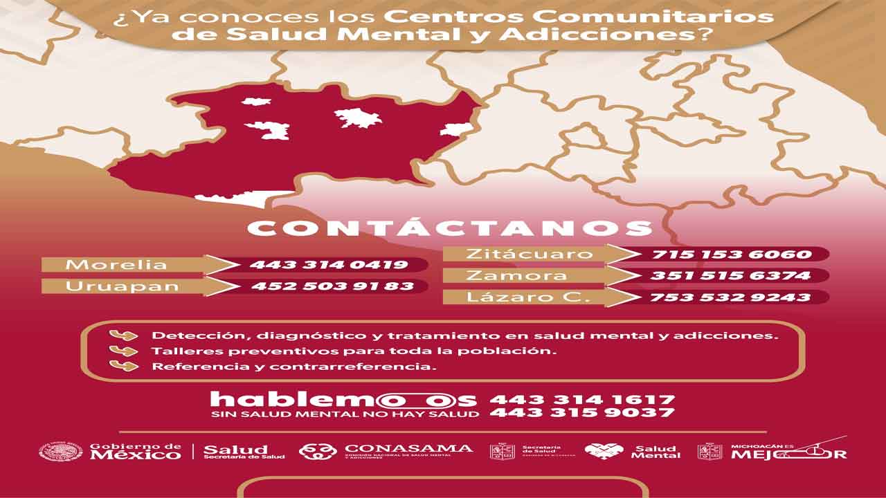 Asimismo, la población puede acudir a los Centros Comunitarios de Salud Mental y Adicciones (Cecosama), donde se ofrecen consultas especializadas, gratuitas y confidenciales. Estos centros se ubican en Morelia, Uruapan, Zamora, Zitácuaro y Lázaro Cárdenas.