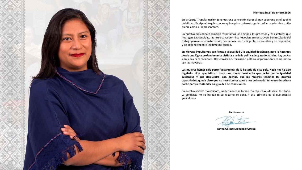 Michoacán, 21 de enero de 2026.– La militante y fundadora de la Cuarta Transformación, Reyna Celeste Ascencio Ortega, llamó a que los debates internos sobre la participación de las mujeres en los espacios de representación política se realicen con responsabilidad, claridad y apego a los principios del movimiento.
