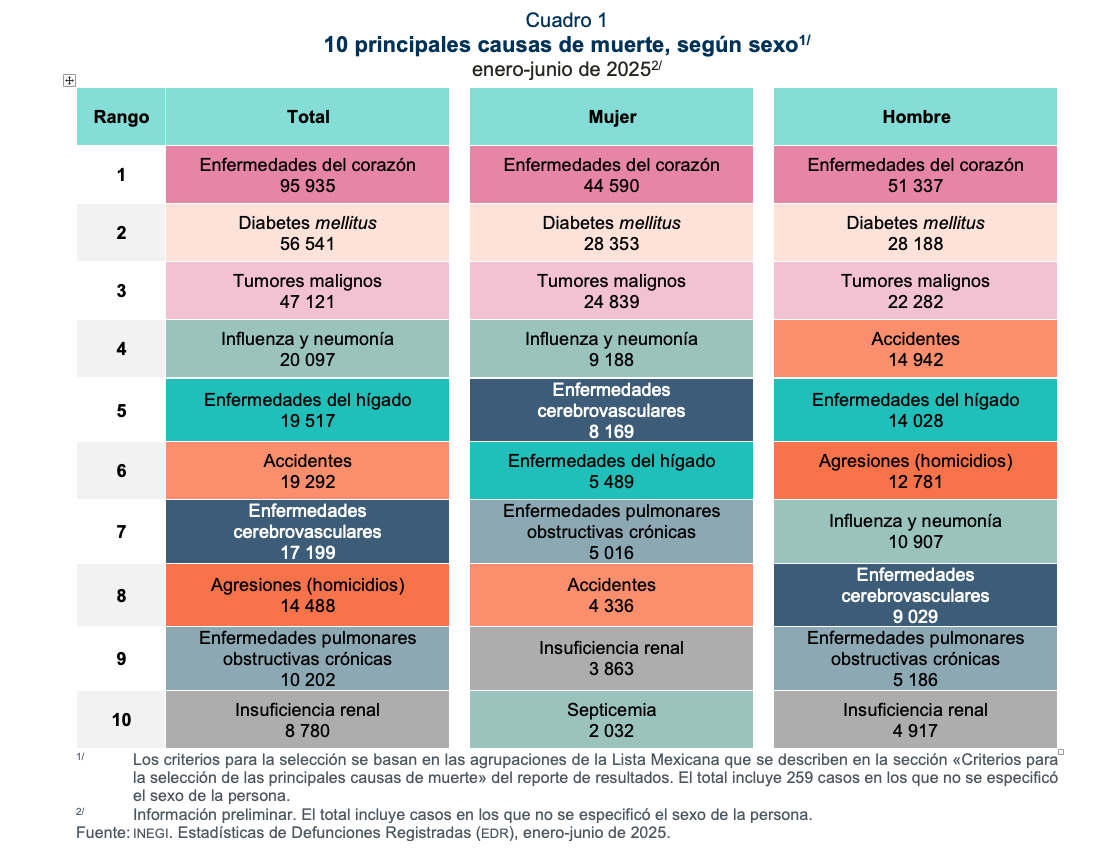 Las enfermedades del corazón, la diabetes mellitus y los tumores malignos fueron las primeras tres causas de defunción a nivel nacional tanto para mujeres como para hombres. A partir de la causa que ocupa la cuarta posición, se observan diferencias entre las 10 principales causas de defunción.