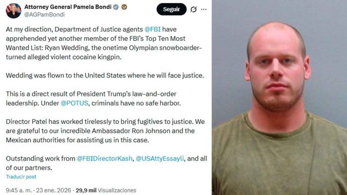 El Gobierno de Estados Unidos reconoció la colaboración de las autoridades mexicanas en la captura de Ryan Wedding, ex atleta olímpico canadiense y uno de los narcotraficantes más buscados por el Buró Federal de Investigaciones (FBI).