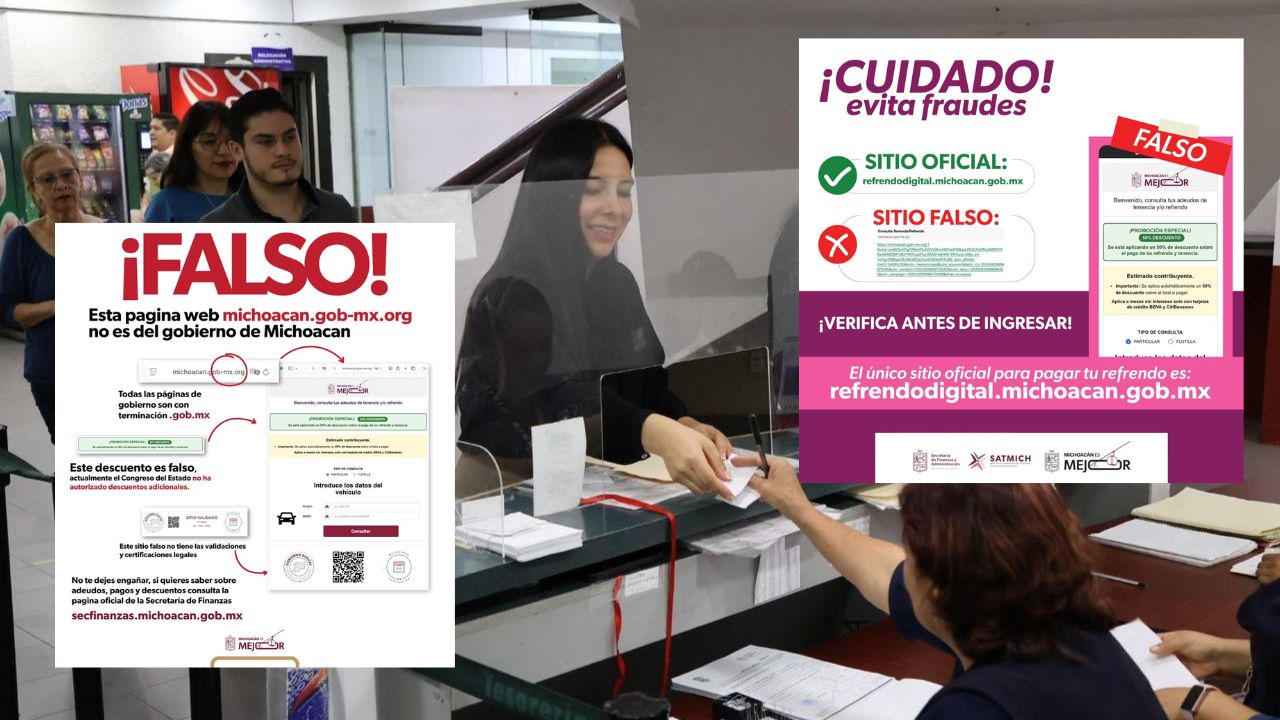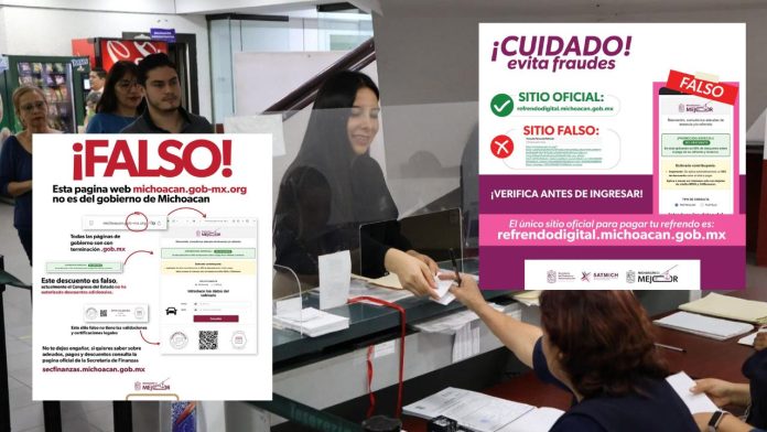 Morelia, Michoacán, 24 de enero de 2026.- Ante el incremento de páginas que en redes sociales ofrecen descuentos y promociones en refrendos, licencias de conducir y diversos trámites vehiculares, la Secretaría de Finanzas y Administración, a través del Servicio de Administración Tributaria de Michoacán (Satmich), alerta a la población para que no se víctima de engaños y fraudes.