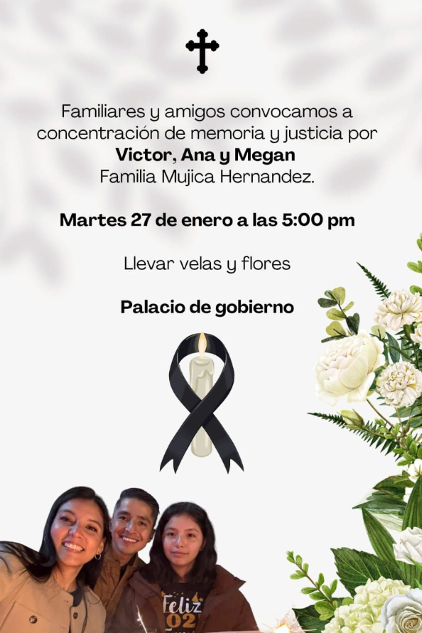 Por esta razón, han convocado a una concentración para pedir justicia y recordar a Víctor, Ana y Megan, que se llevará a cabo el próximo 27 de enero a las 17:00 horas, frente al Palacio de Gobierno.