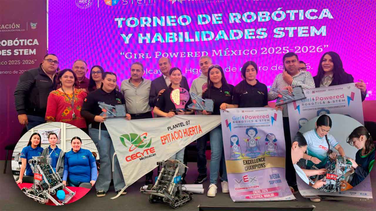 Pachuca, Hidalgo, 28 de enero de 2026.- Alumnas del Colegio de Estudios Científicos y Tecnológicos de Michoacán (Cecytem) representarán a México en el Mundial de Robótica en San Luis Misuri, Estados Unidos, tras triunfar en el evento Girl Powered 2026. En esta competencia celebrada en Pachuca, Hidalgo, las estudiantes se coronaron con seis galardones de primer lugar y un tercer puesto, consolidándose como líderes en tecnología y ciencia.