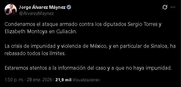 En reacción a los hechos, el coordinador nacional de Movimiento Ciudadano, Jorge Álvarez Máynez, condenó la agresión y exigió que el caso no quede impune. A través de redes sociales, señaló que la situación de violencia en Sinaloa ha superado límites preocupantes y afirmó que su partido se mantendrá atento al avance de las investigaciones.