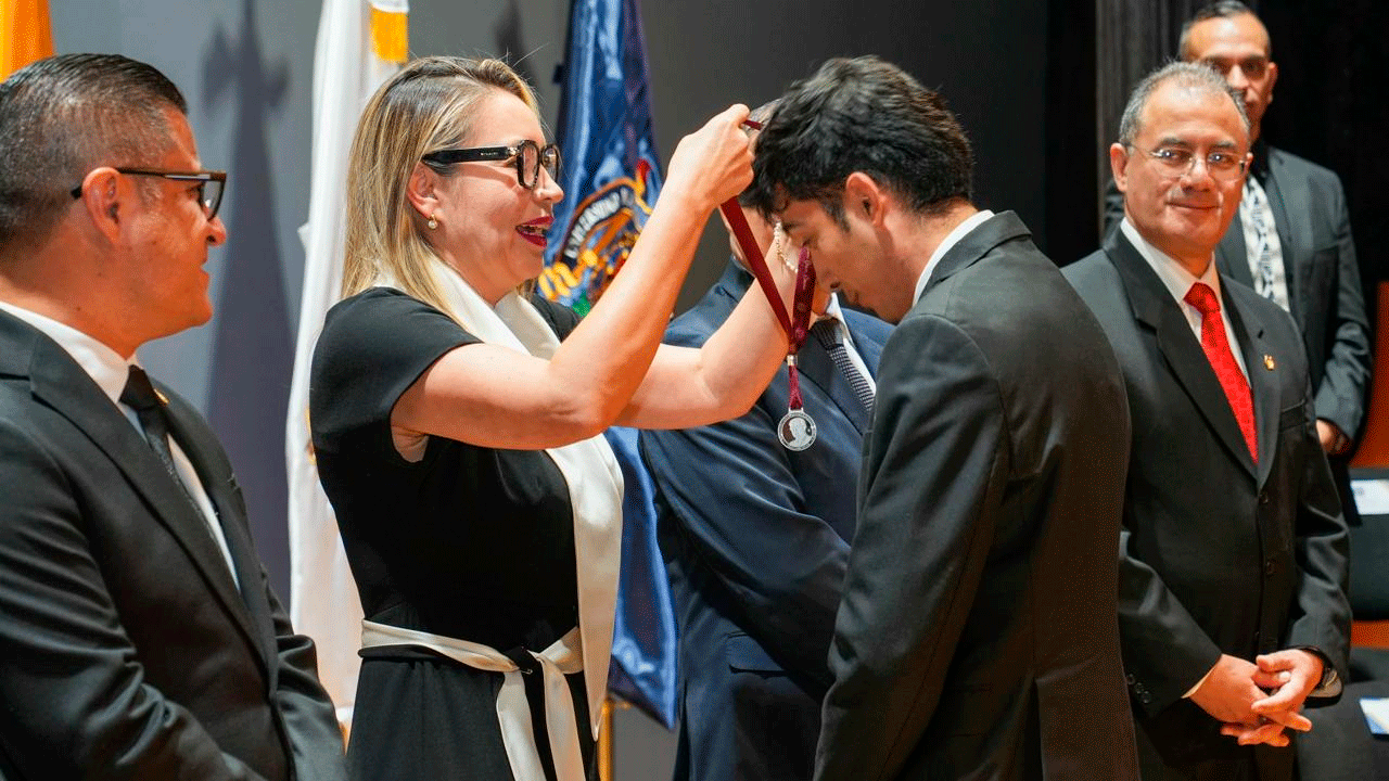En representación de las egresadas y egresados que recibieron la medalla, Jorge Miguel Santacruz, compartió que este reconocimiento no es ùnicamente un mérito individual es en realidad el reflejo de un proceso formativo riguroso, exigente y profundamente humano, “que se construye dia a dia en las aulas, laboratorios, clínicas y espacios académicos de nuestra Universidad”. Agregó que el obtenerlo implica un compromiso renovado, ejercer la profesión con ética, seguir produciendo conocimientos de calidad y contribuir activamente al desarrollo científico, social y humano.
