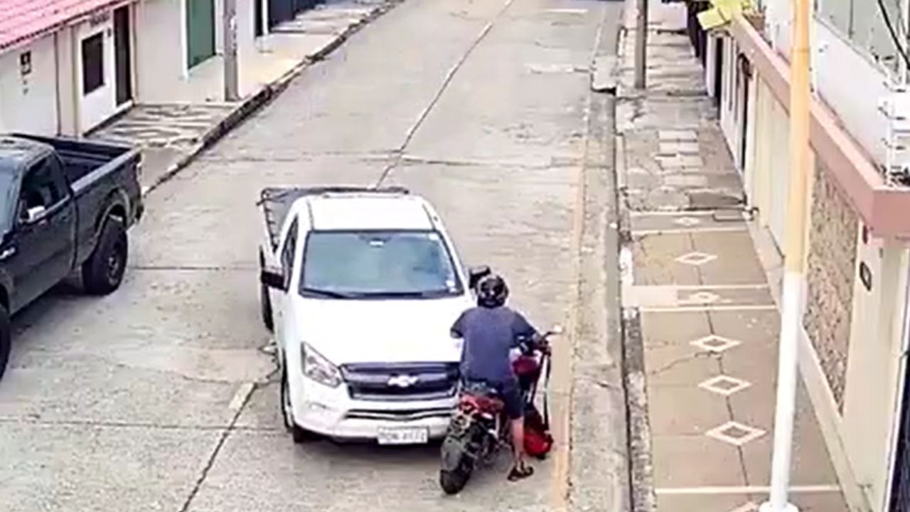 Un video que circula en redes sociales muestra el momento exacto en que un presunto ladrón es impactado por una camioneta, junto con la motocicleta que utilizaba, mientras aparentemente cometía un robo.