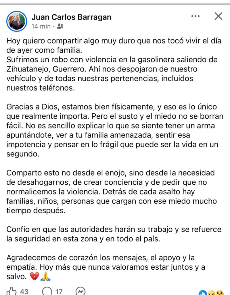 Morelia, Michoacán.— El diputado local Juan Carlos Barragán informó que él y su familia fueron víctimas de un robo con violencia cuando transitaban por una gasolinera a la salida de Zihuatanejo, Guerrero, donde sujetos armados los despojaron de su vehículo y de todas sus pertenencias, incluidos teléfonos celulares.