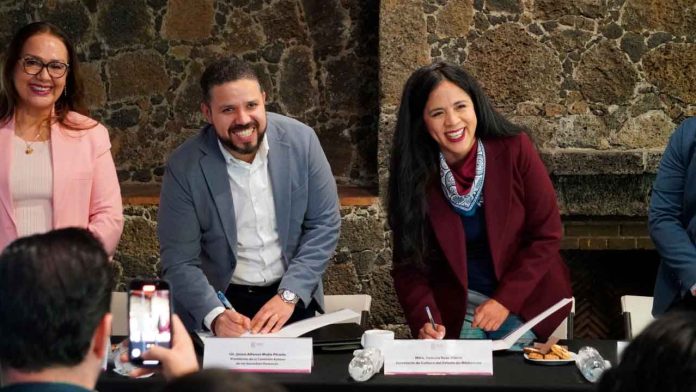 Morelia, Michoacán, 04 de febrero de 2026. Al firmar un convenio de colaboración con la Secretaria de Cultura del Estado (SECUM), Tamara Sosa Alanís, el presidente de la Comisión Estatal de los Derechos Humanos (CEDH), Josué Mejía, dijo que las alianzas contribuyen a construir un Michoacán mejor.