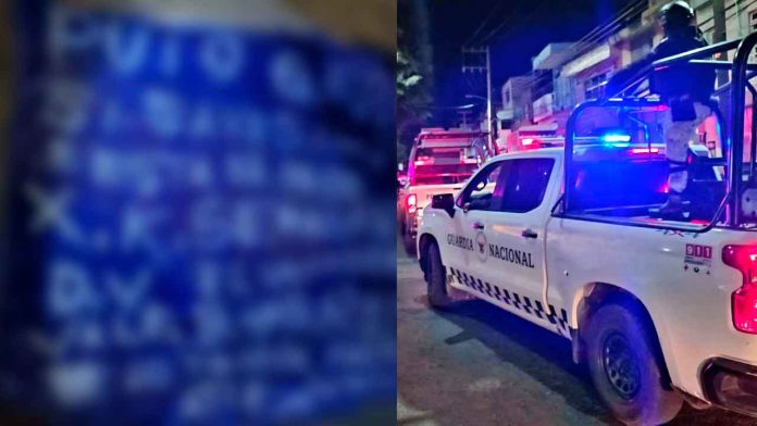 Era temprano cuando los elementos de seguridad detectaron una manta azul, de letras blancas, suspendida sobre el cableado de la avenida principal, justo frente a la tienda de abarrotes conocida como “LuLu”.