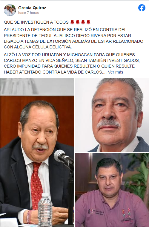 La presidenta municipal de Uruapan, Grecia Quiroz, reconoció la detención del alcalde de Tequila, Jalisco, Diego Rivera Navarro, y sostuvo que esta acción debe marcar un precedente en el combate a la impunidad por presuntos vínculos con el crimen organizado y delitos de extorsión.