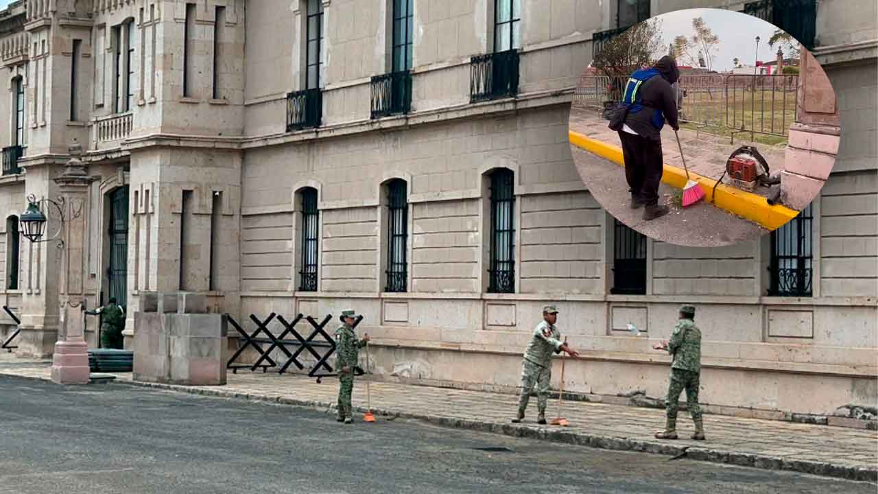 Desde la tarde, alrededor de 10 personas realizan labores de corte de pasto, arreglo de jardines y limpieza de fuentes, así como barrido en el exterior de la llamada Casa del Soldado, donde las áreas verdes presentaban deterioro por la falta de mantenimiento en meses recientes.