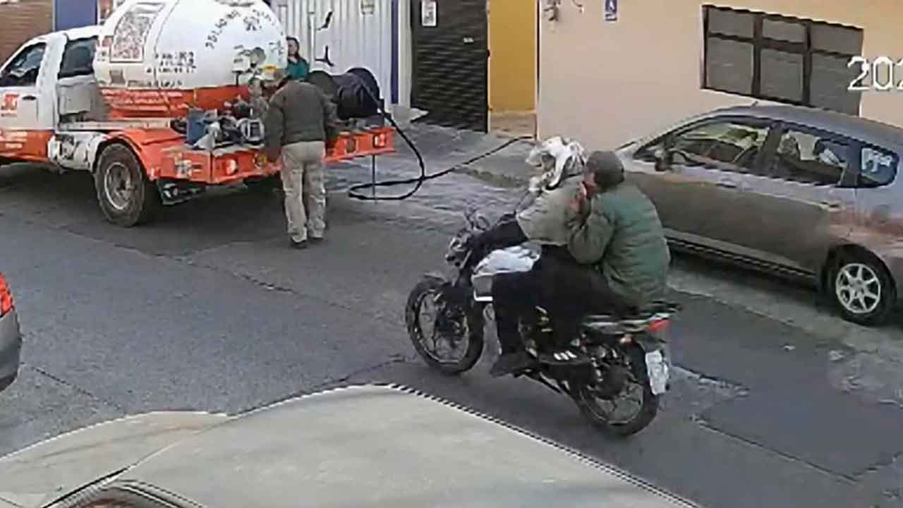 Morelia, Mich.- Jueves 05 de febrero de 2026.- Una cámara de videovigilancia captó el momento exacto cuando dos sujetos que viajaban a bordo de una motocicleta presuntamente asaltaron a un trabajador de la empresa gasera “ServiGas”, delito registrado en la colonia moreliana Ventura Puente.