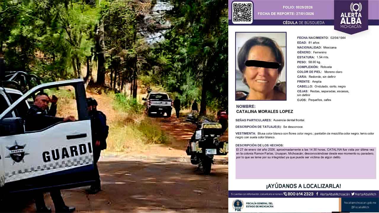 Uruapan, Mich.- 09 de febrero de 2026.- Una mujer adulta mayor fue localizada sin vida, al interior de una barranca del cerro de la Cruz, al norte de la ciudad de Uruapan. La fallecida con estaba reportada como desaparecida y contaba con Alerta Alba.