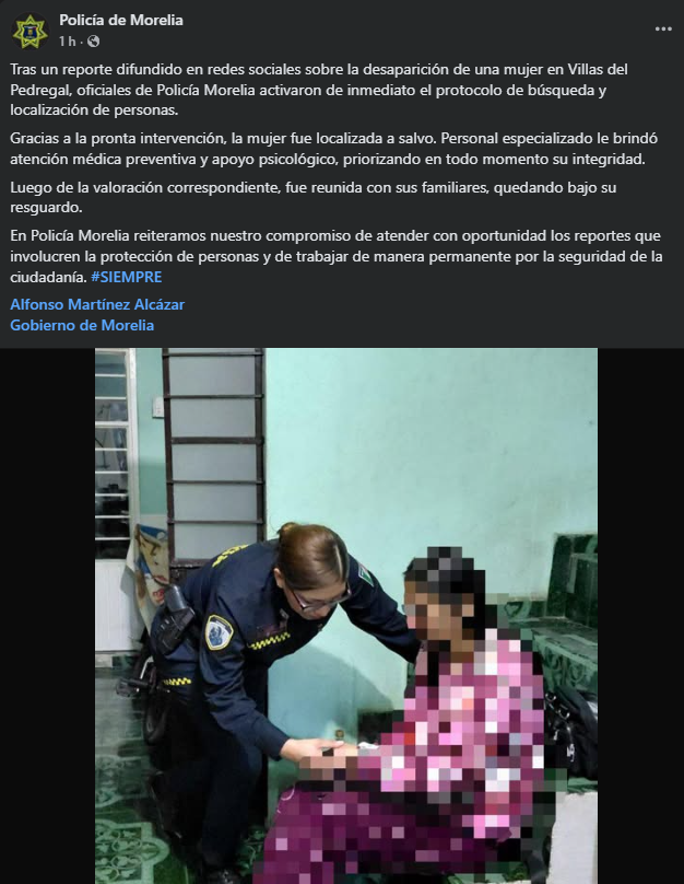 Horas después, la corporación municipal informó que la joven fue encontrada con bien gracias a la rápida intervención policial. Durante el operativo, personal especializado le brindó atención médica preventiva y acompañamiento psicológico para garantizar su bienestar.