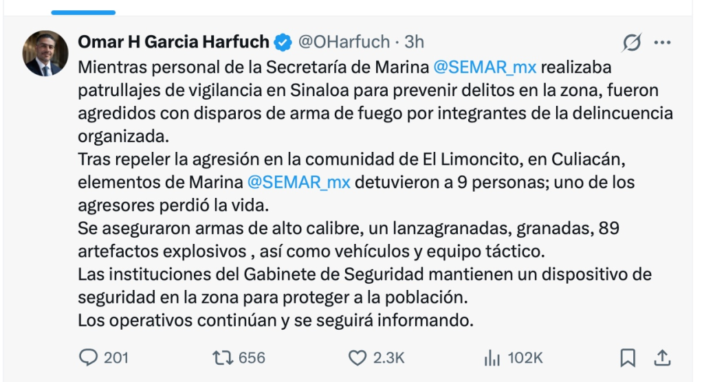 Elementos de la Secretaría de Marina (Semar) fueron agredidos con disparos de arma de fuego mientras realizaban patrullajes de vigilancia en Sinaloa, informó el secretario de Seguridad y Protección Ciudadana, Omar García Harfuch.