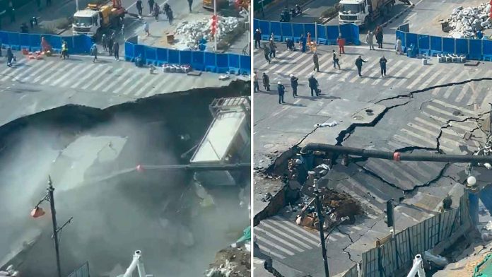 El incidente ocurrió el 11 de febrero en el distrito de Minhang, en la intersección de Qixin Road y Li’an Road, donde se construye una nueva línea del sistema de transporte subterráneo. Videos muestran cómo el pavimento se fractura y en cuestión de segundos se forma un amplio cráter en la vía pública.