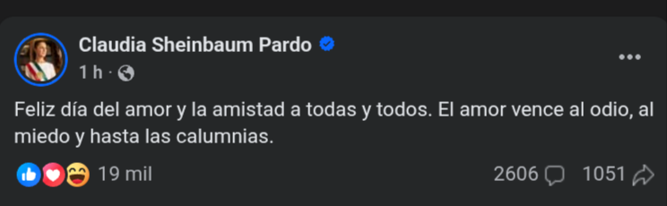 La presidenta Claudia Sheinbaum difundió este 14 de febrero un mensaje con motivo del Día del Amor y la Amistad, en el que exhortó a privilegiar valores como la solidaridad, el afecto y la convivencia social.