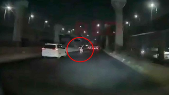 En las imágenes se aprecia que la motocicleta avanza por la vía cuando la acompañante lleva los brazos levantados. Instantes después, una camioneta que se aproxima por el carril de alta velocidad los impacta, provocando que ambos ocupantes salgan proyectados y queden tendidos sobre el asfalto.