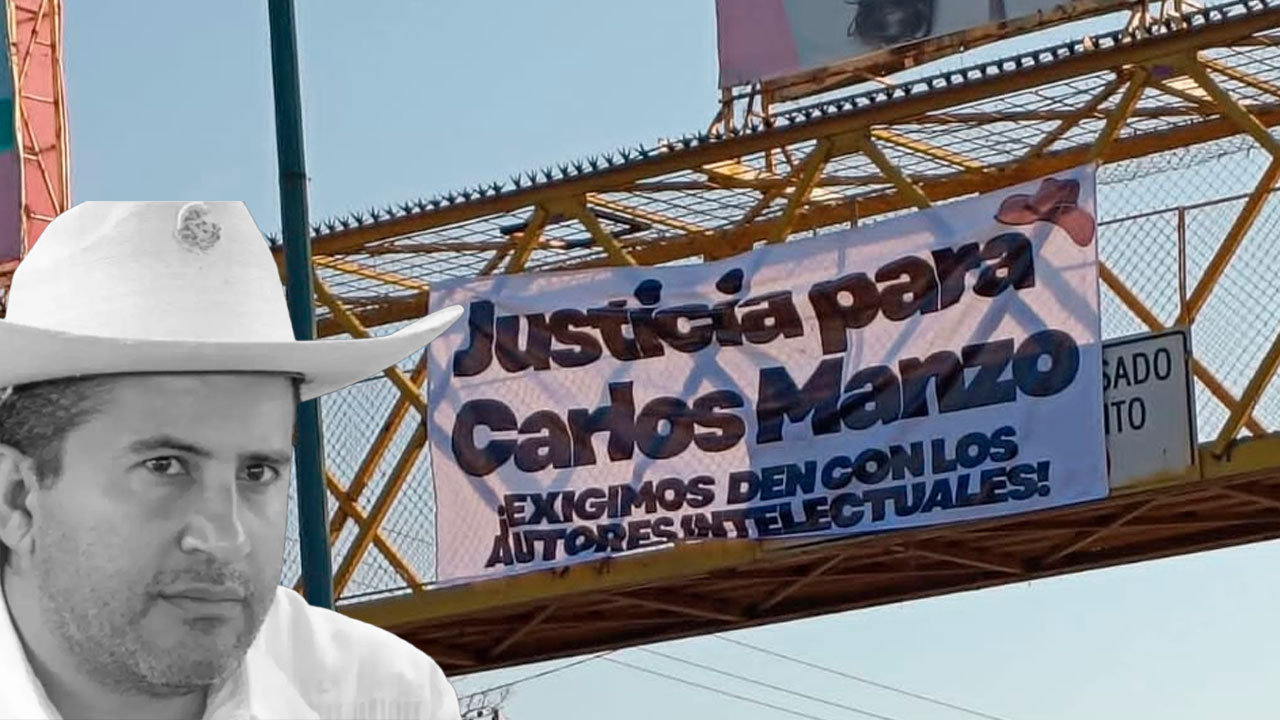 Morelia, Mich.- Martes 17 de febrero de 2026.- Una lona con la leyenda “Justicia para Carlos Manzo ¡Exigimos den con los autores intelectuales!” fue colocada la mañana de este martes en lo alto de un puente peatonal ubicado sobre la avenida Francisco I. Madero Poniente, casi esquina con la avenida San Juanito Itzícuaro, al poniente de Morelia.