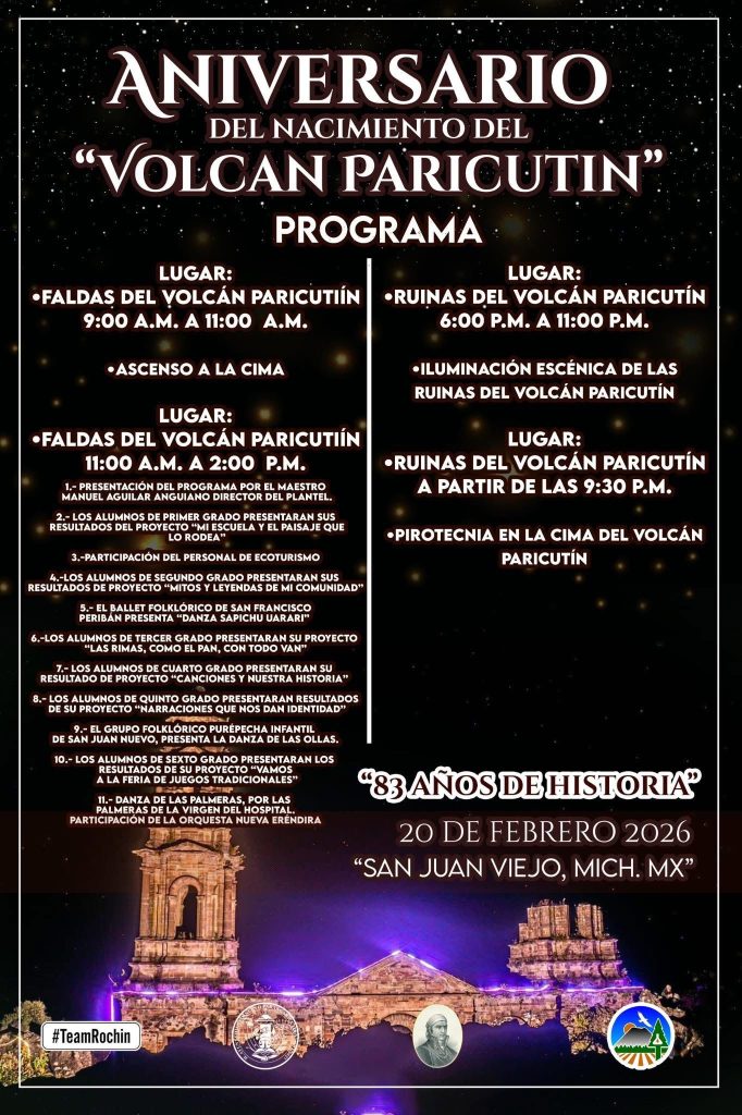 El municipio conmemorará este viernes 20 de febrero el 83 aniversario del nacimiento del volcán Paricutín, ocurrido en 1943, con una jornada de actividades culturales y actos cívicos programados por la mañana y la noche.