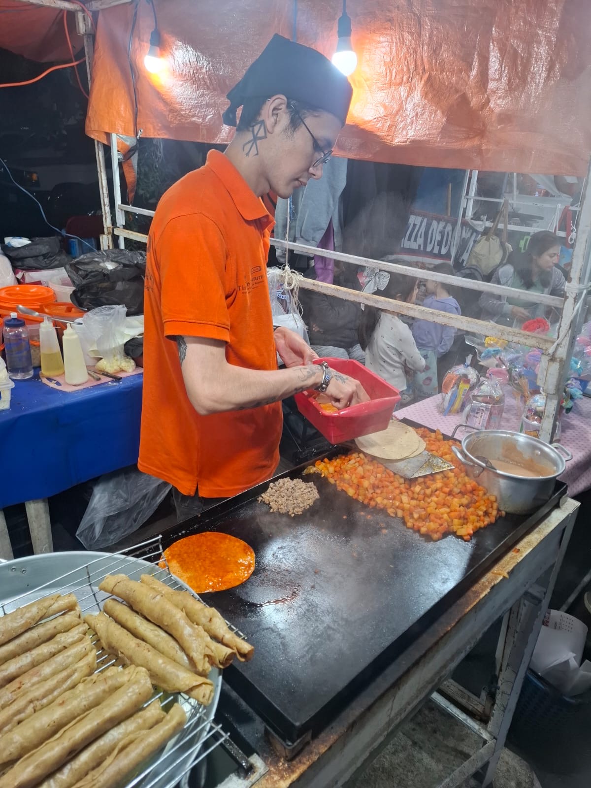 Pero sin duda, uno de los principales atractivos es la zona gastronómica. El aroma a carne asada, tacos dorados y antojitos recién preparados invade el ambiente. Los puestos de churros, preparados al momento y bañados en azúcar, se convierten en parada obligatoria para chicos y grandes. Las parrillas encendidas, las cazuelas humeantes y los grandes comales forman parte del espectáculo culinario que distingue a este mercado.