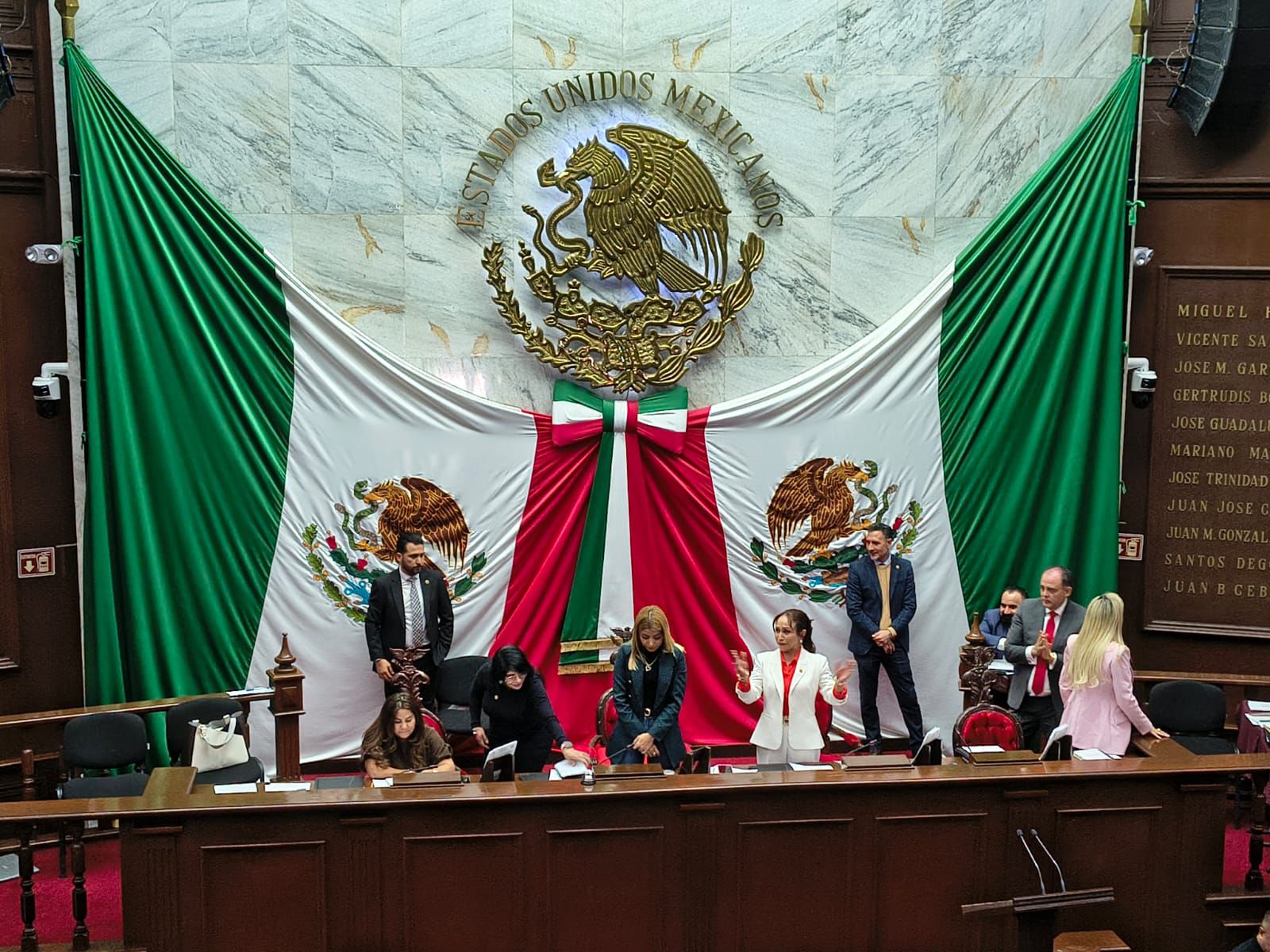 Diputadas locales tomaron la Mesa Directiva del Congreso de Michoacán durante la sesión de este jueves en protesta por la iniciativa del gobernador Alfredo Ramírez Bedolla para desincorporar poco más 34 inmuebles estatales.