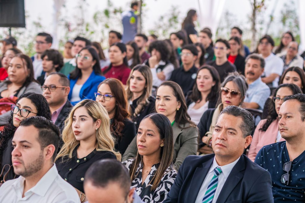 El Rector Fundador destacó también el valor del lema institucional “El verde es nuestro”, enfatizando que el crecimiento de la universidad se realiza con responsabilidad ambiental. Explicó que el campus incorpora sistemas de captación de agua de lluvia para riego, tratamiento de aguas residuales para su reutilización, reducción del consumo energético hasta en un 22% y programas permanentes de reforestación, reiterando que crecer implica hacerlo con sentido, calidad y compromiso social y ambiental. Posteriormente, el Mtro. René Zamora Torres, Director de Medianas Empresas Región Centro de Banco Santander y egresado de la institución, expresó su orgullo por formar parte de este proyecto educativo y destacó el compromiso de la institución financiera para respaldar el financiamiento del plan de expansión, consolidándose como aliado estratégico para el desarrollo de infraestructura educativa de alto nivel.