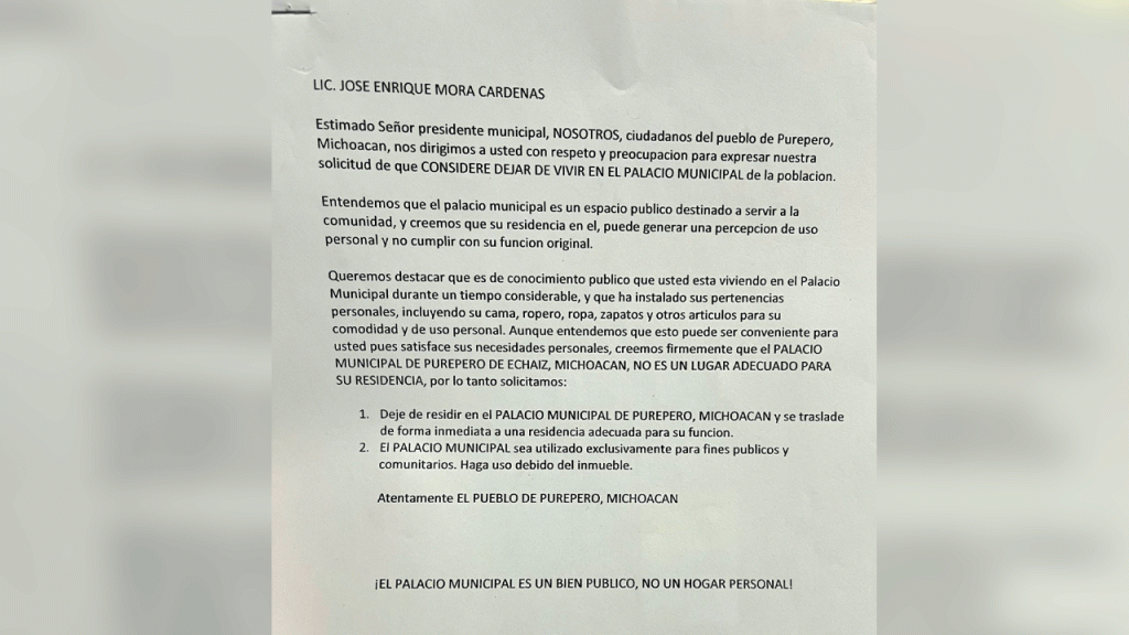 “Estimado Señor presidente municipal, NOSOTROS, ciudadanos del pueblo de Purepero, Michoacan, nos dirigimos a usted con respeto y preocupacion para expresar nuestra solicitud de que CONSIDERE DEJAR DE VIVIR EN EL PALACIO MUNICIPAL de la población”, refiere parte del escrito.