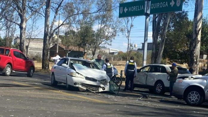 Morelia, Mich.- Domingo 01 de marzo de 2026.- Al menos tres vehículos protagonizaron un choque sobre la carretera Morelia-Quiroga, a la altura de la entrada a la Tenencia de Capula, en el municipio de Morelia, informaron autoridades policiales y de rescate.