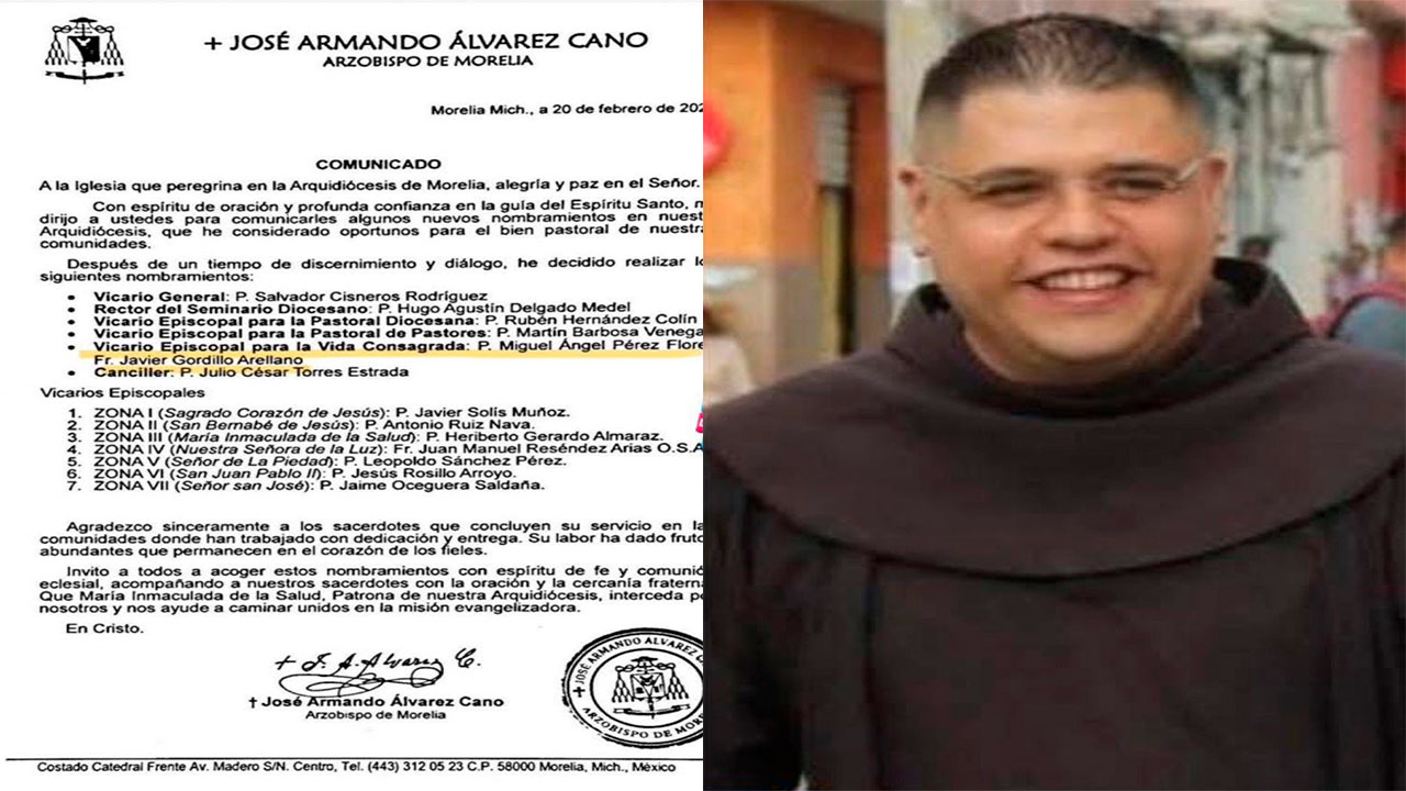 El sacerdote franciscano Javier Gordillo Arellano fue nombrado Vicario Episcopal para la Vida Consagrada dentro de la Arquidiócesis de Morelia, derivado de una serie de ajustes en la estructura pastoral impulsados por el nuevo arzobispo.