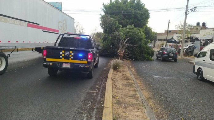 Otro árbol cayó sobre un camellón central de la avenida Pedregal, entre las calles Huatápera y Abutilon, en las cercanías del Libramiento Norponiente, a la altura de la colonia Eduardo Ruiz.