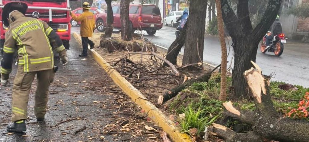 Morelia, Mich.- Jueves 05 de marzo de 2026.- Al menos cuatro árboles colapsaron en distintos puntos de Morelia debido a los fuertes vientos que se registraron durante la tarde de este jueves en algunas zonas. Afortunadamente, no hubo personas lesionadas ni vehículos dañados, informaron fuentes policiales y de rescate.