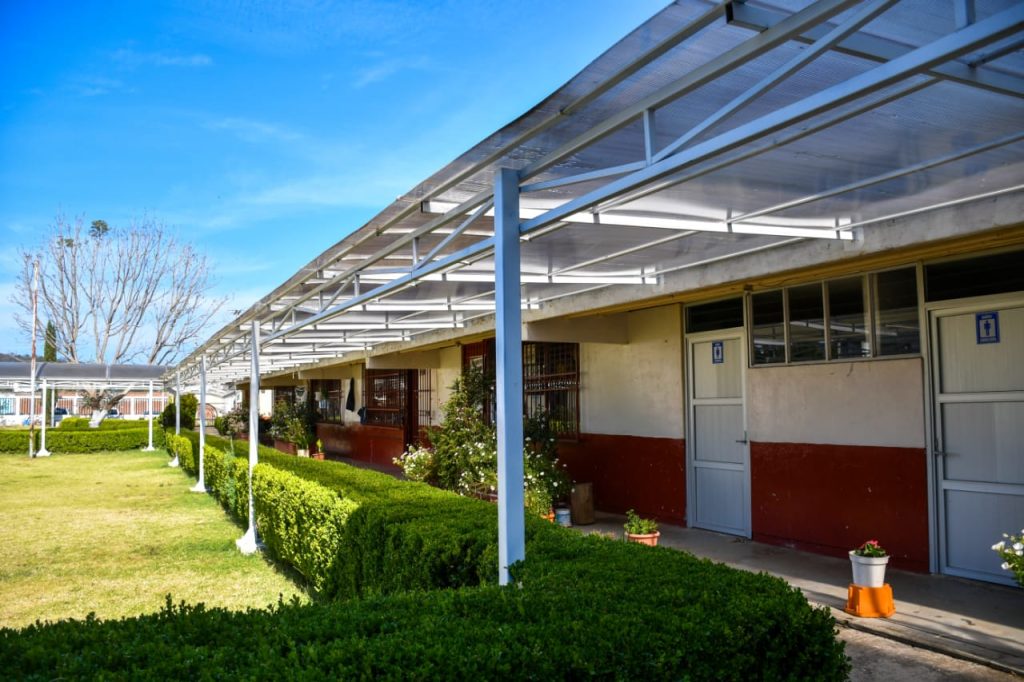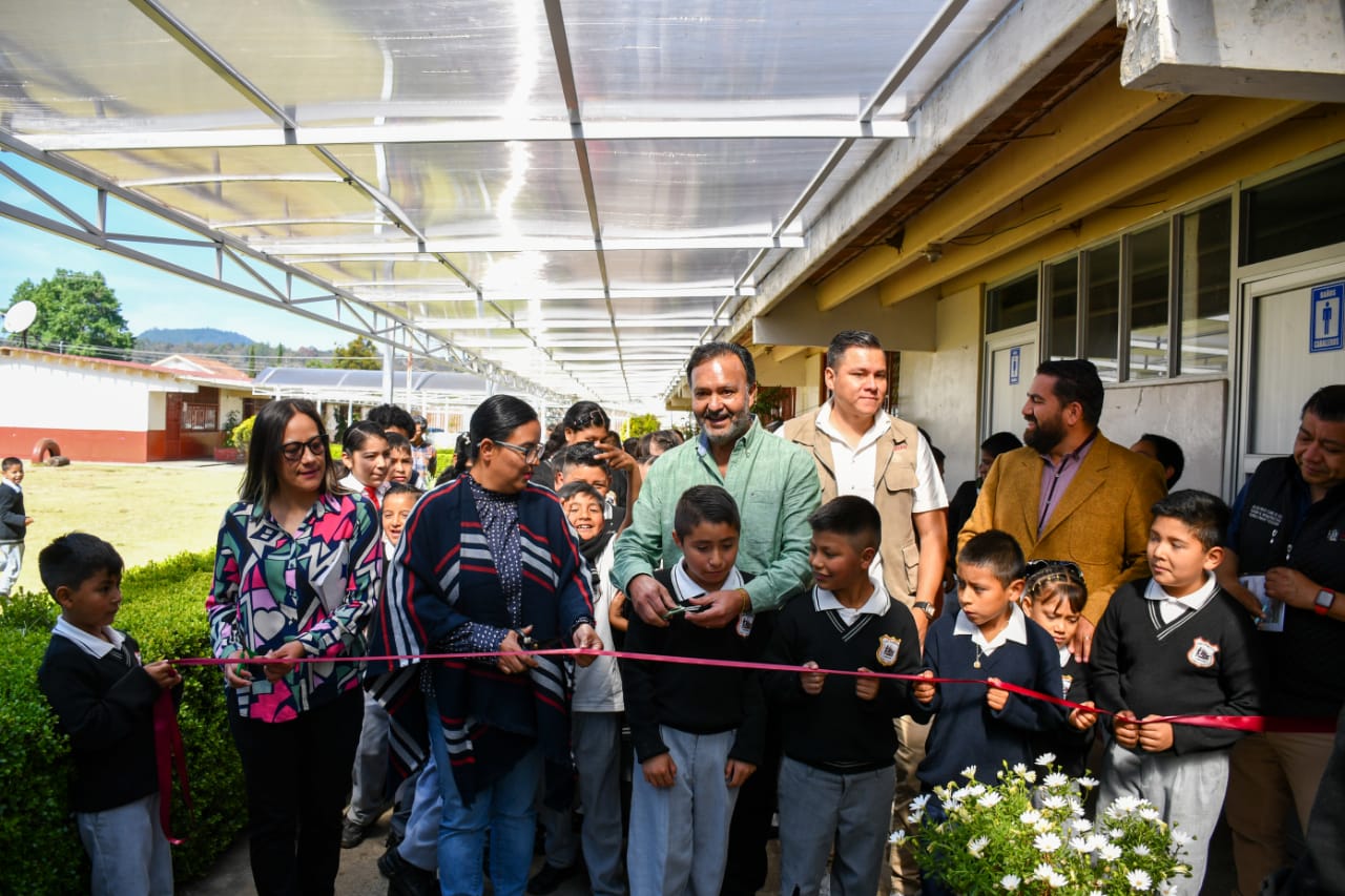 Durante la actividad, autoridades municipales, docentes, madres y padres de familia, así como estudiantes, participaron en el corte de listón del techado de pasillos, una obra que brinda mayor protección, seguridad y mejores condiciones para el desarrollo de las actividades escolares.
