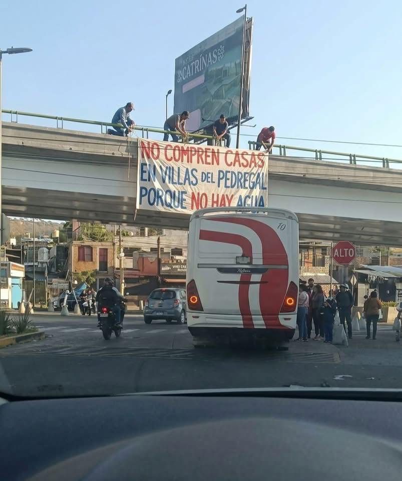 Mediante redes sociales se ha difundido una imagen en la que presuntos vecinos del Fraccionamiento Villas del Pedregal colocaron una manta sobre las inmediaciones del Puente Superior elevado “Paso Catrinas”, a unos cuantos metros de l entrada al fraccionamiento, en donde los colonos señalan falta de agua potable en el fraccionamiento.