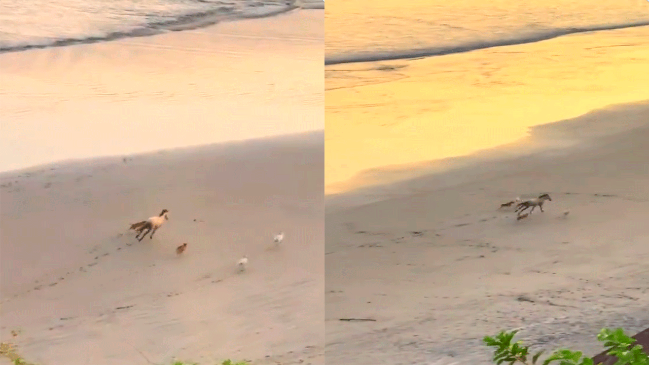 En las imágenes se observa cómo los animales avanzan a toda velocidad sobre la arena mientras el oleaje llega suavemente a la playa. Los pequeños perros siguen el paso del caballo, creando una escena que muchos usuarios calificaron como “mágica” y llena de energía.