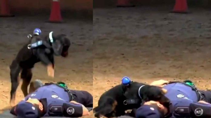 En las imágenes, difundidas por la corporación, el perro realiza maniobras similares a la reanimación cardiopulmonar (RCP) sobre un agente que simula estar inconsciente, siguiendo instrucciones de su adiestrador.