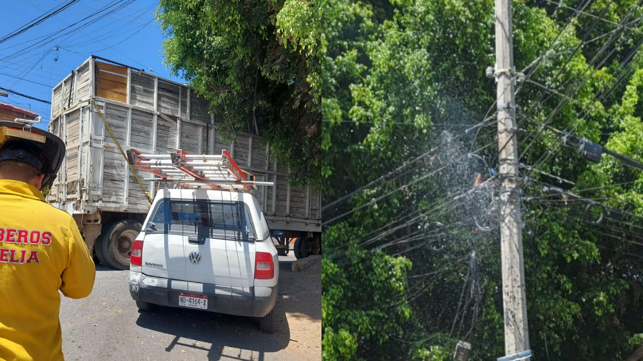 Morelia, Mich.- Viernes 20 de marzo de 2026.- Un camión torton que transportaba madera se atoró en unos cables de mediana y baja tensión, provocando un cortocircuito que dañó un poste de la Comisión Federal de Electricidad (CFE) en la colonia moreliana Colinas del Sur, además dejó sin suministro de luz a varios asentamientos aledaños, comentaron fuentes de rescate.
