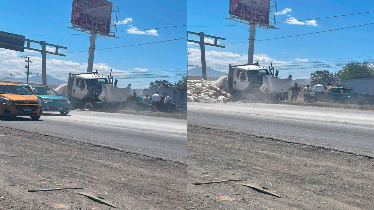 Este 21 de marzo de 2026, alrededor de las 13:35 hrs, un camión cargado con bultos de cemento sufrió un accidente en la salida de Morelia hacia Salamanca, justo a la altura del Aga, en dirección a Tarímbaro.