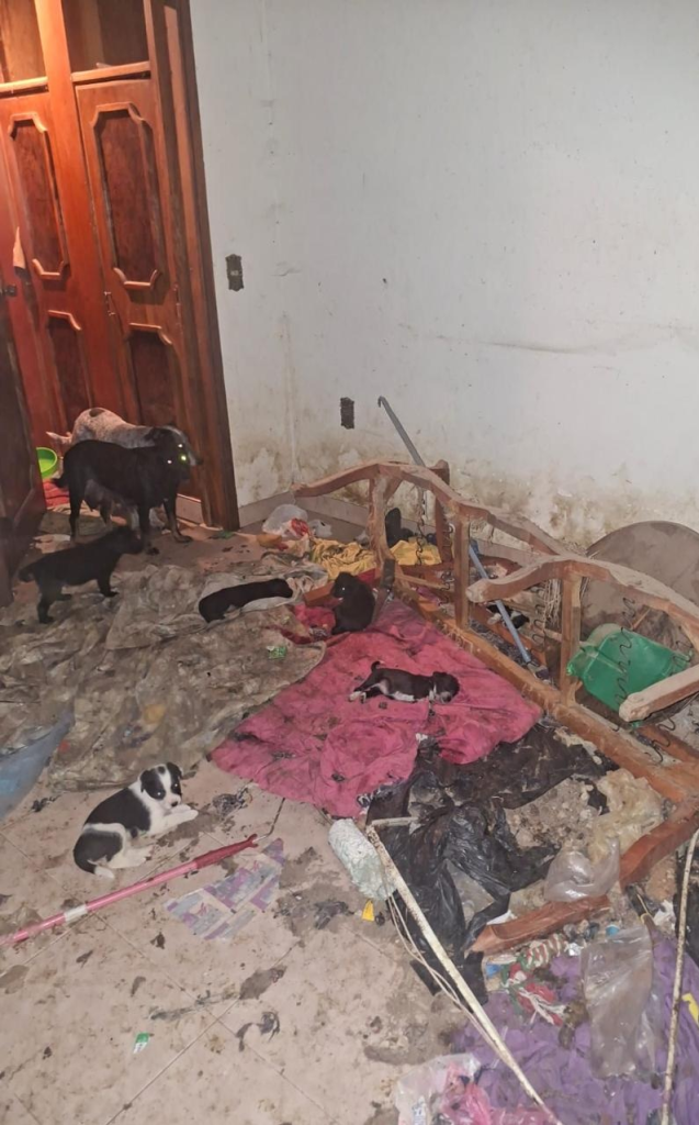 Los caninos presentaban visibles signos de maltrato, con lesiones, desnutrición y un marcado deterioro en su estado de salud. El inmueble se encontraba en condiciones insalubres, con acumulación excesiva de heces, basura y objetos en desuso, generando un entorno de abandono y riesgo para los animales.