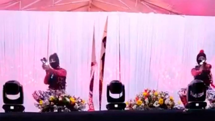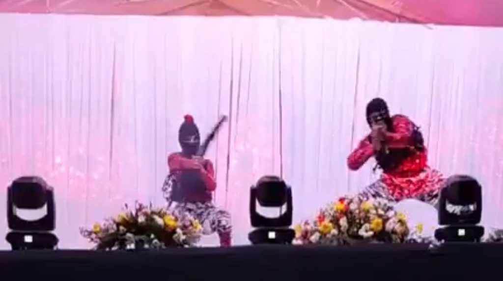 En las imágenes, grabadas durante un evento realizado el pasado martes, se observa a varios jóvenes con el rostro cubierto ejecutando una rutina en la que portan lo que aparentan ser armas presuntamente de utilería, las cuales utilizan como parte de la escenografía al simular detonaciones.
