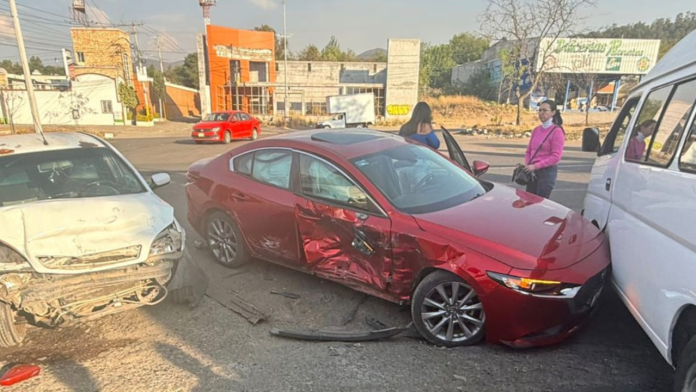 Morelia, Mich.- Jueves 26 de marzo de 2026.- Una camioneta tipo combi y dos automóviles protagonizaron un choque sobre la carretera Morelia-Pátzcuaro, a la altura de la desviación a Cointzio, informaron autoridades policiales, las cuales agregaron que únicamente hubo daños materiales.