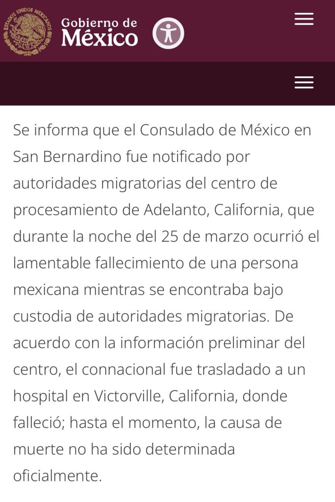 El consulado de México en San Bernardino fue notificado por las autoridades migratorias sobre el deceso.Según la información preliminar, el connacional fue trasladado a un hospital en Victorville, donde finalmente perdió la vida. Hasta el momento, la causa de muerte no ha sido determinada de manera oficial.Ante estos hechos, la SRE manifestó su preocupación por posibles omisiones y deficiencias en la atención médica brindada dentro del centro de detención.