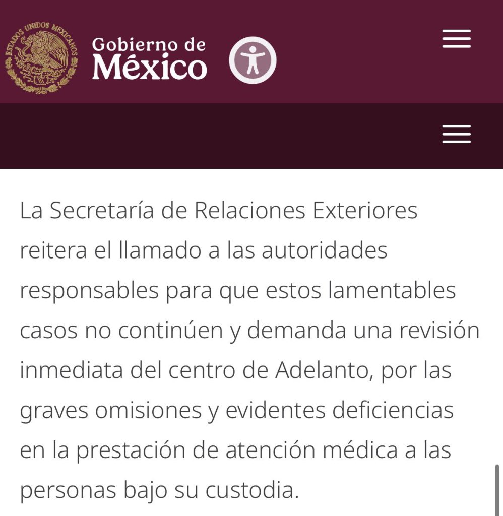 Por ello, reiteró su llamado a las autoridades correspondientes para realizar una revisión inmediata de las condiciones en el lugar y evitar que situaciones similares se repitan.La dependencia federal también aseguró que el Gobierno de México dará seguimiento puntual al caso y agotará todas las vías legales y diplomáticas para esclarecer lo ocurrido, así como para garantizar justicia para el connacional fallecido.