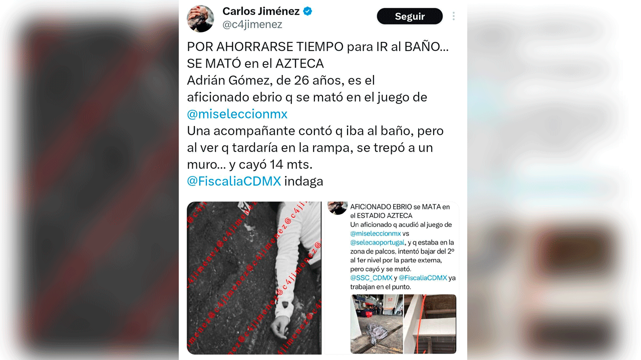 De acuerdo con información del periodista Carlos Jiménez, la víctima, Adrián Gómez, de 26 años, presuntamente buscaba “ahorrarse tiempo” para llegar al baño.