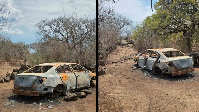 Morelia, Mich.- Lunes 30 de marzo de 2026.- Un vehículo Honda City desvalijado y totalmente calcinado fue encontrado en una solitaria brecha de terracería que conduce de la colonia El Cerrito Itzícuaro al fraccionamiento Villas del Pedregal, al poniente de Morelia, trascendió en la cobertura de la noticia.