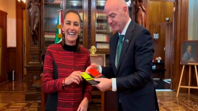 El presidente de la FIFA, Gianni Infantino, realizó un gesto simbólico al obsequiar las tarjetas oficiales amarilla y roja a la presidenta de México, Claudia Sheinbaum.