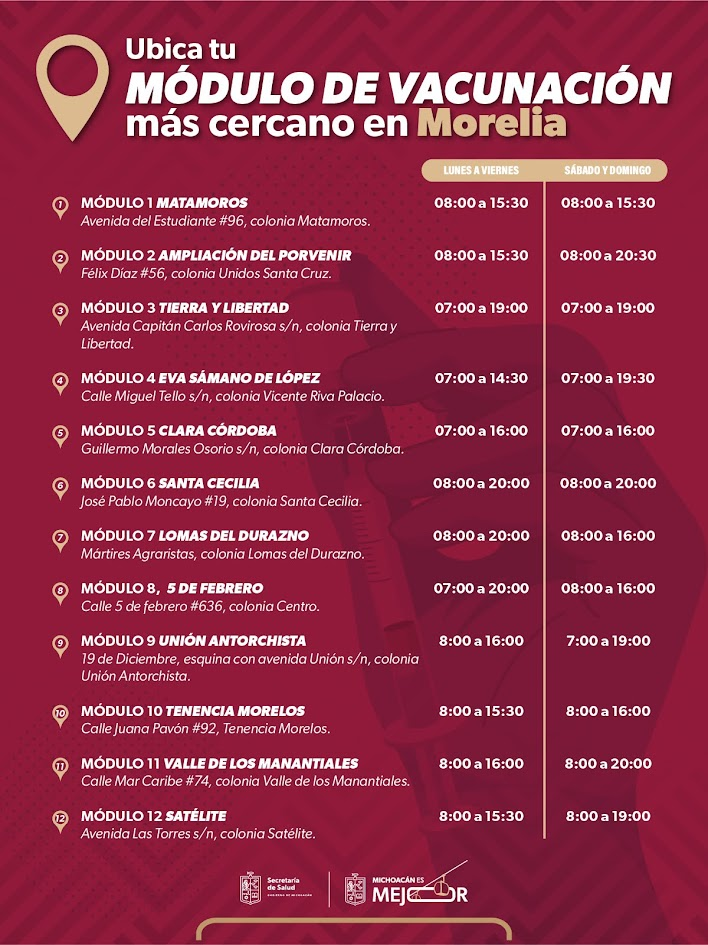 Asimismo, en Morelia, la ciudadanía tiene a su disposición 12 módulos de vacunación distribuidos estratégicamente en la ciudad. Para ubicar la unidad más cercana a su domicilio, así como los horarios en los que se realiza la vacunación, se puede consultar el siguiente enlace: https://photos.app.goo.gl/Y161SCjM4yEMLKEB7.