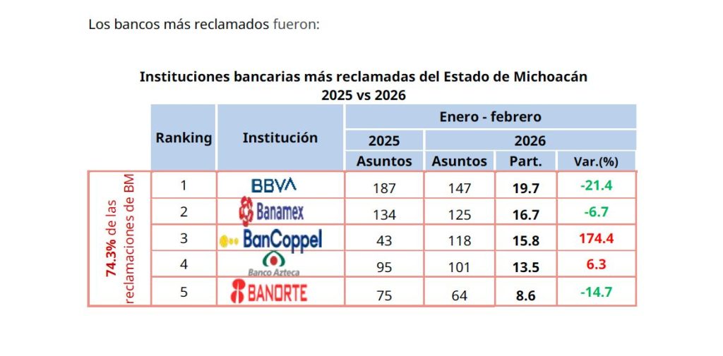 La CONDUSEF informó que durante el primer bimestre del 2026 atendió un total de 1,089 reclamaciones en el estado de Michoacán, cifra que representa el 2.3% del total nacional y una disminución del 3.3% en comparación con el mismo periodo del año anterior.