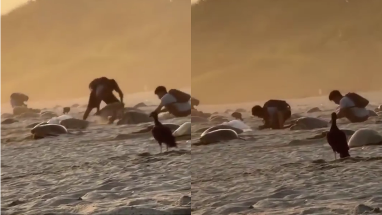 En las imágenes se observa a varias personas extrayendo huevos directamente de los nidos e interfiriendo con ejemplares durante el proceso de desove, una práctica considerada delito federal al afectar especies protegidas como la tortuga golfina.